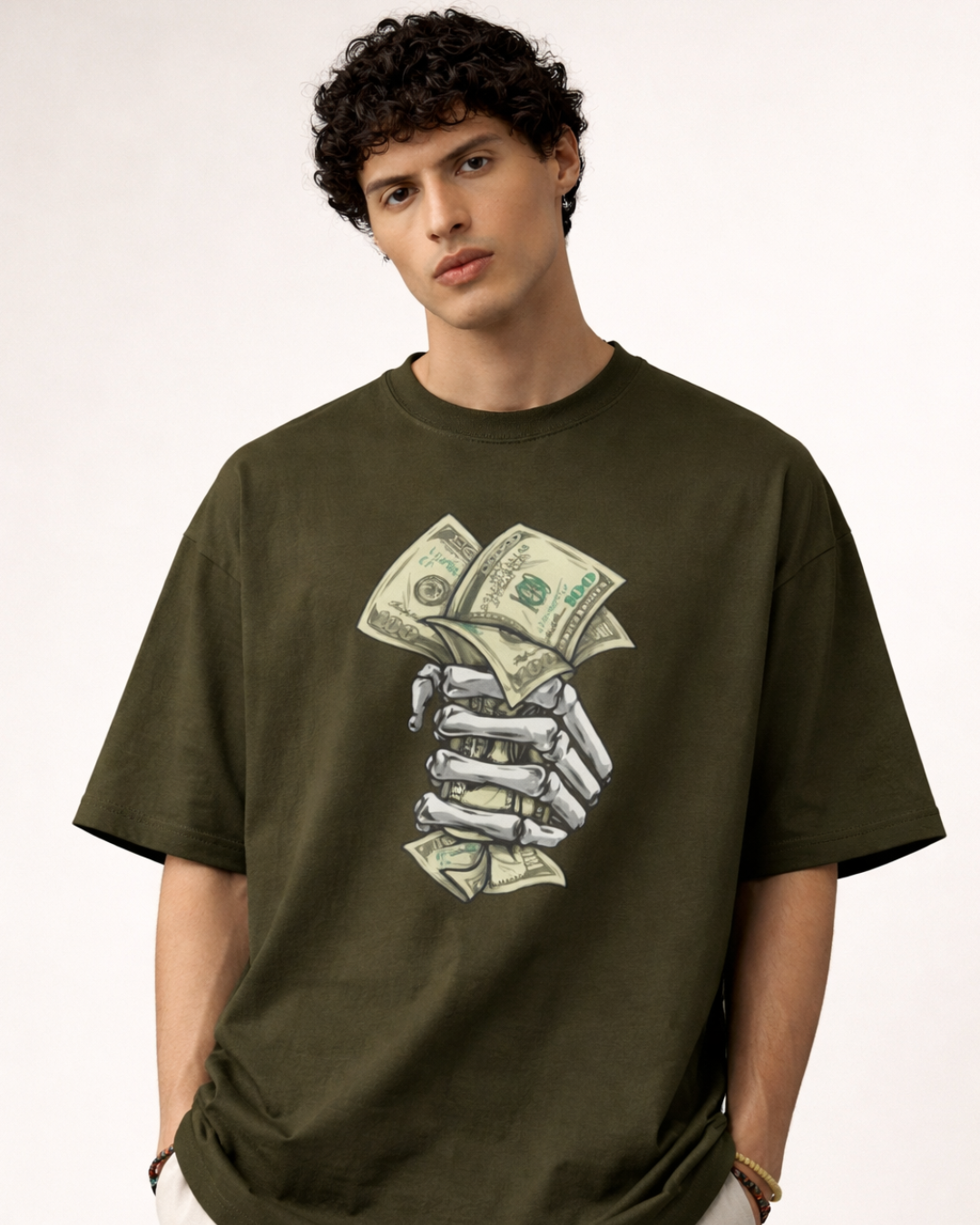 Grind now, flex forever. A bold skeleton hand clutching cash graphic that hits different on the streets. The olive colorway keeps it raw and real. Oversized fit for those who know the value of every rupee they earn.